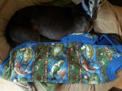 The catch of the day! Beautiful double layered fleece coat with fish motif made especially for greyhounds. Dimensions are not available but the dog shown is 76# and it fit him well.